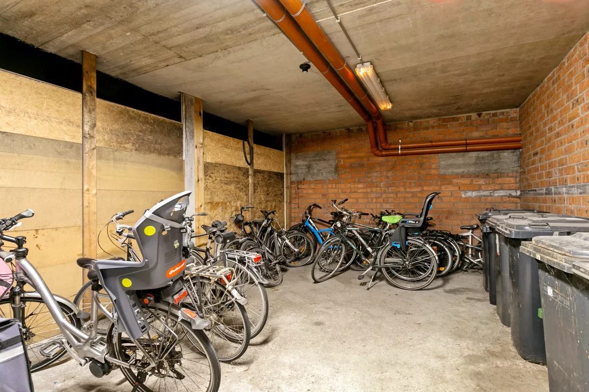 Achteraan de tuin is er een deur die leidt naar de garage, waar u beschikt over een parkeerplaats en bergplaats voor o.a. fietsen en vuilnis.