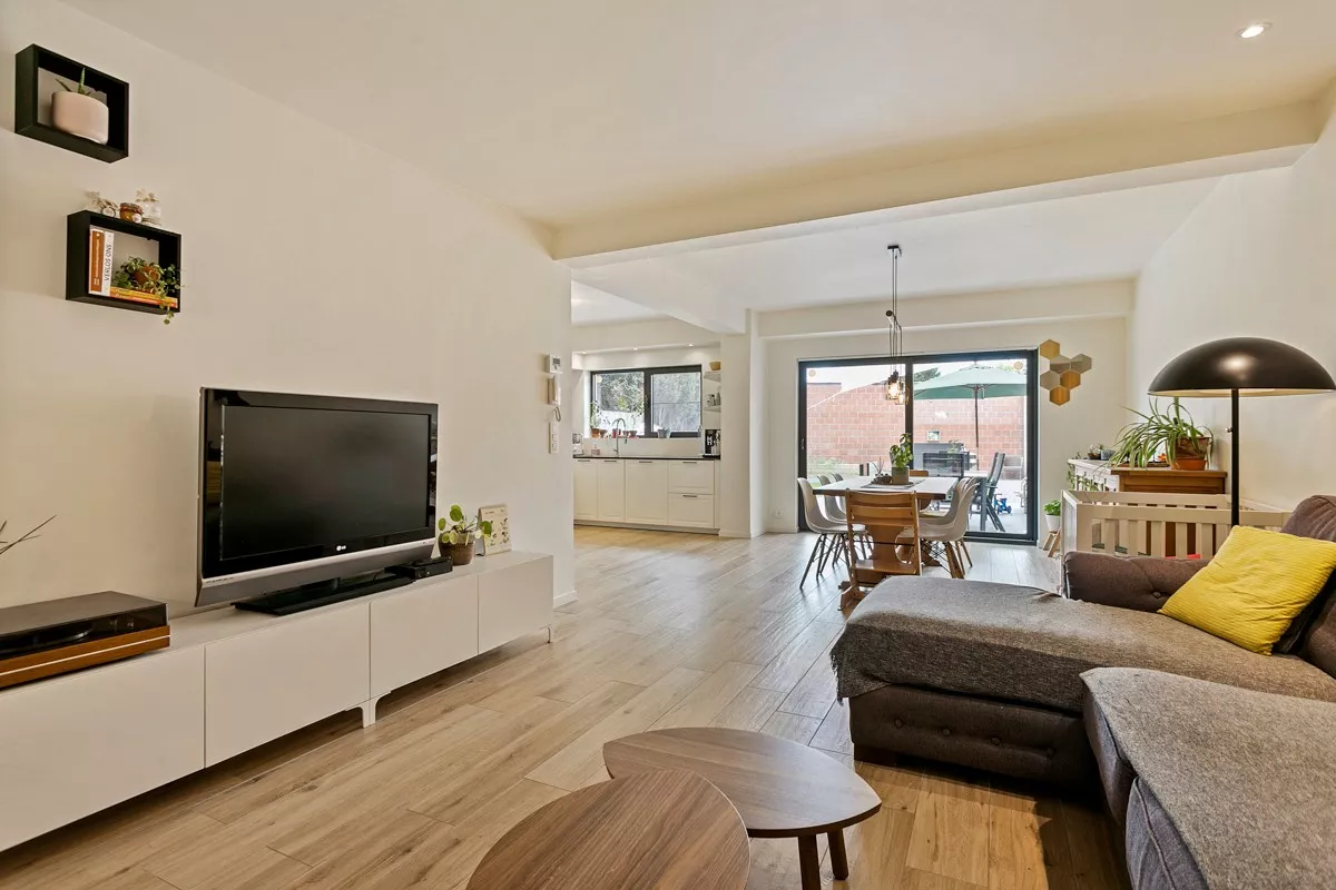 De lichtrijke woonkamer bevindt zich achteraan. De grote raampartijen zorgen voor veel lichtinval en bieden tevens een leuk zicht op, alsook toegang tot het terras en de leuke westelijk georiënteerde tuin.