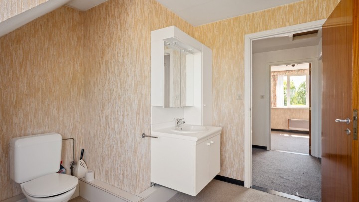 Vervolgens treffen we de badkamer uitgerust met een ligbad met douchefunctie en een enkele lavabo. Verder bevindt er zich een apart toilet en een zonnige veranda met een prachtig uitzicht over de grote, zuidelijk georiënteerde tuin met terras. Het terras beschikt over een elektrische zonneluifel.