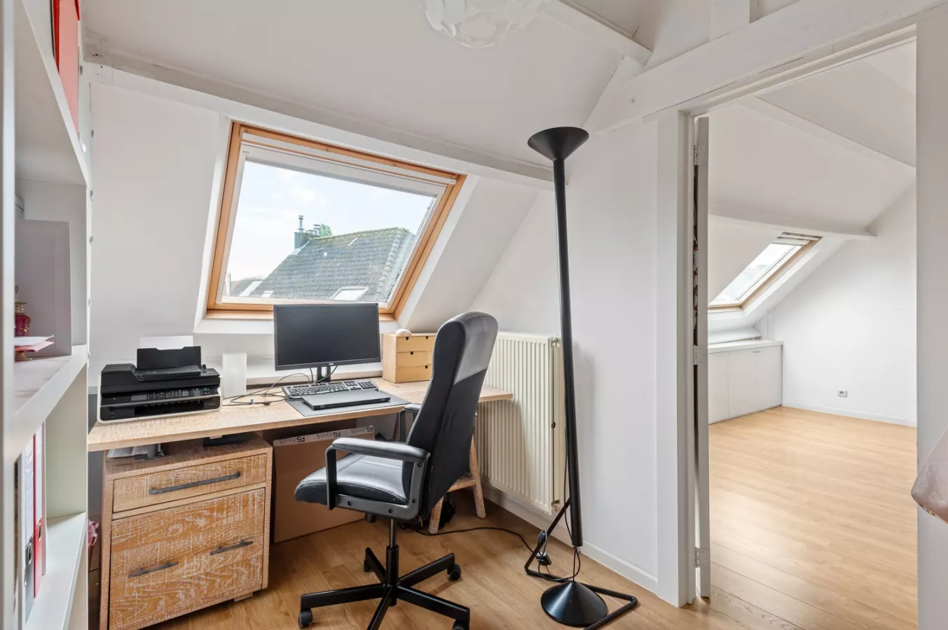 De tweede verdieping omvat nog een grote slaapkamer (23m²) en een bureauruimte.