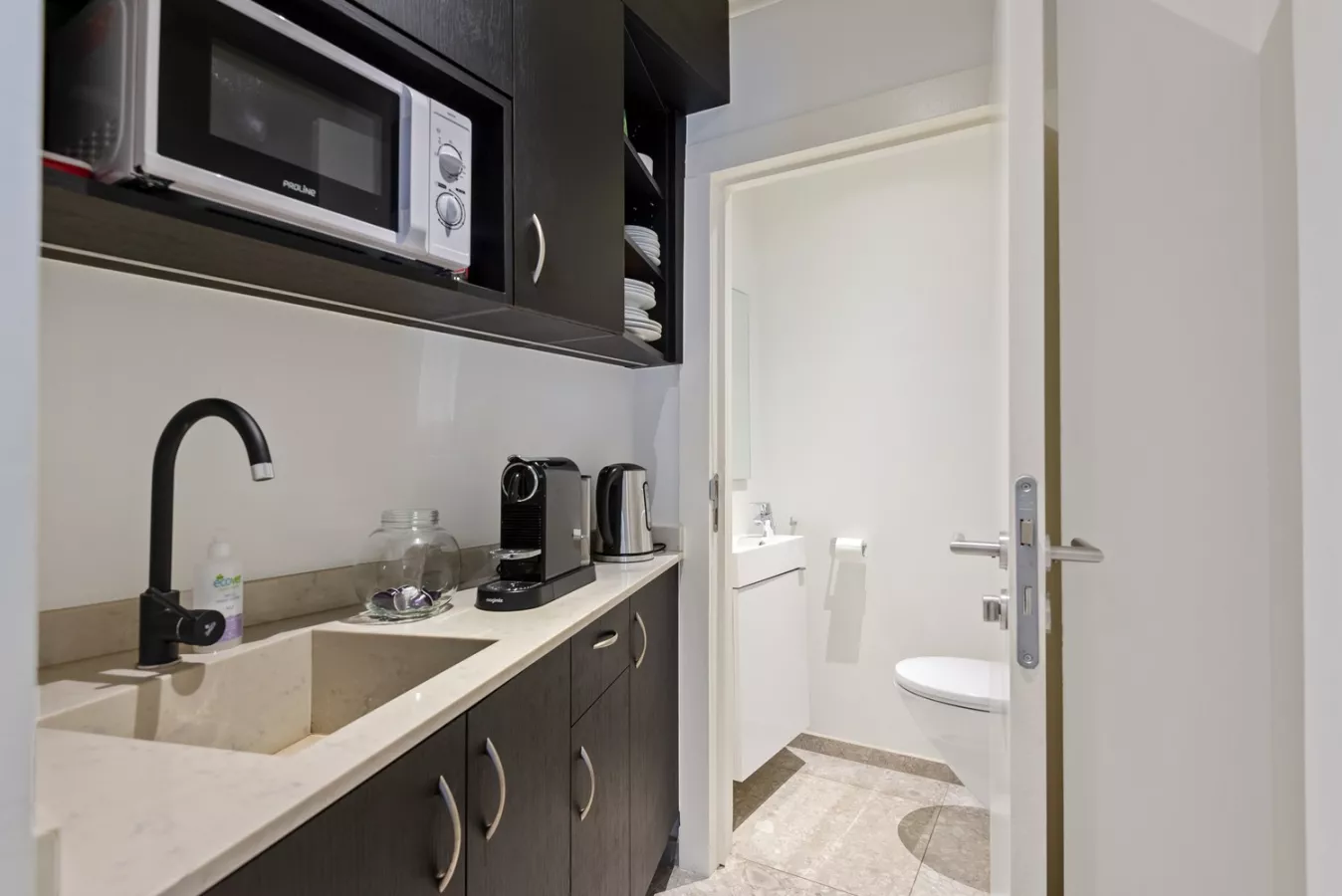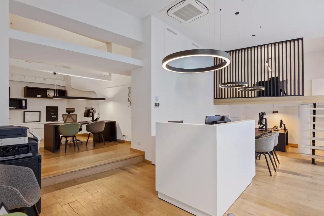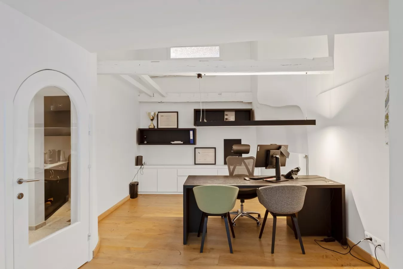 Er is op dit niveau treffen we naast de handelsruimte een wc met handenwasser, trendy kitchenette met composieten werkblad en vaatwasser, alsook een extra ruimte (mezzanine) dat kan dienst doen als extra winkelruimte en/of bureelgedeelte.