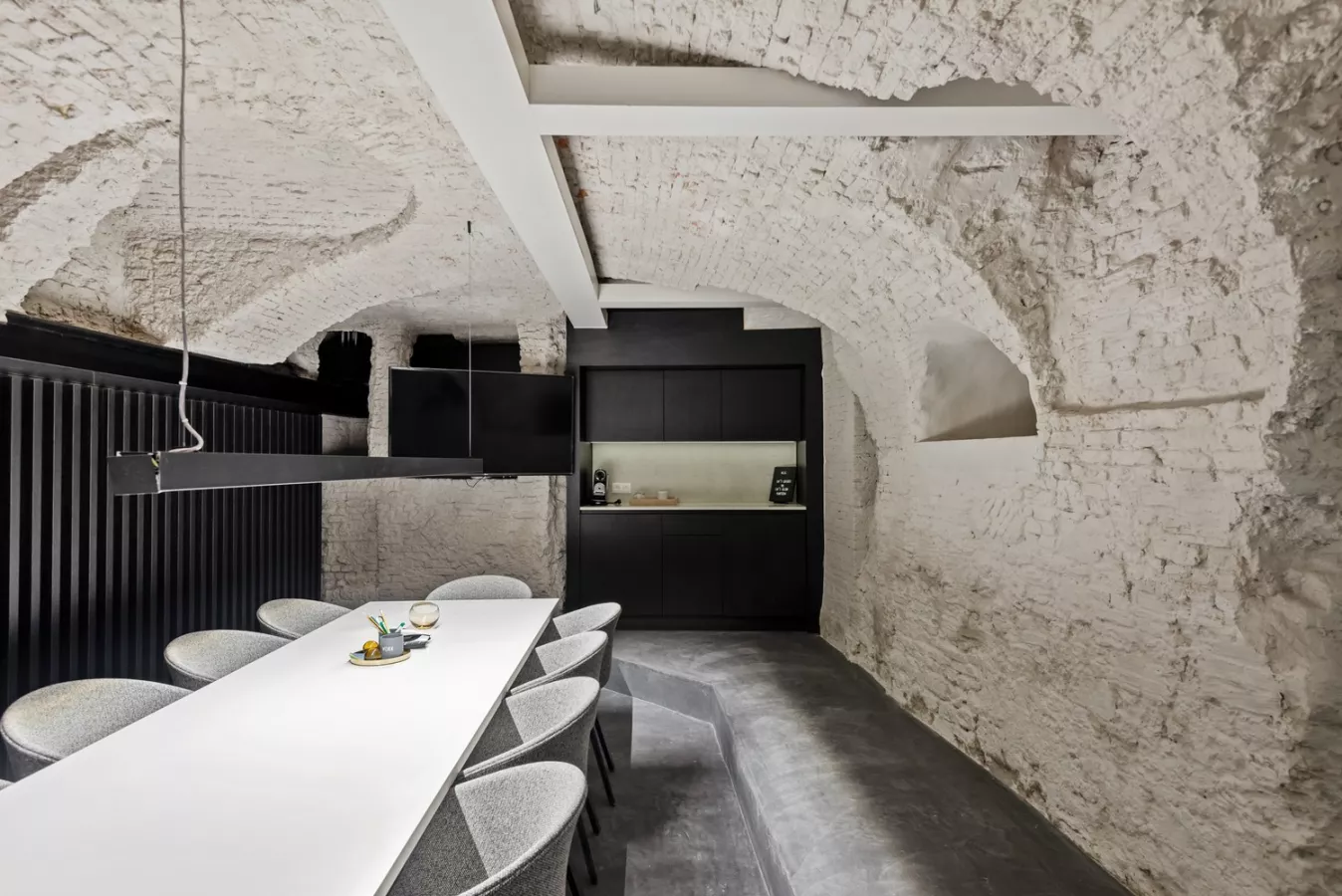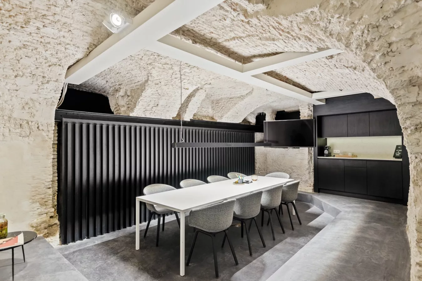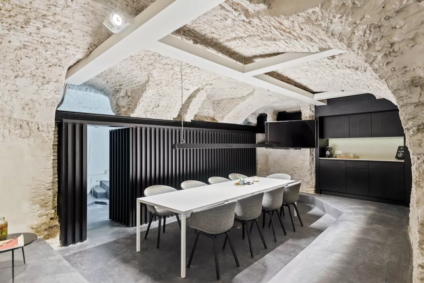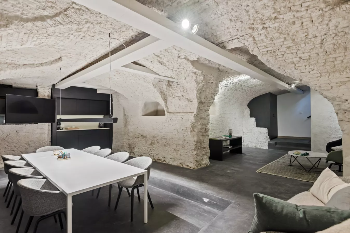 De kelderverdieping (+/- 65m²) is toegankelijk via een brede trap in parket en werd afgewerkt in mortex. Deze ruimte straalt authenticiteit uit vanwege de aanwezige boogwelfsels. Deze ruimte beschikt over een leuke ingebouwde coffee corner, een ingebouwde vestiaire en kan polyvalent aangewend worden. Achter een stijlvolle wand vinden we tevens nog een praktische ruime berging.