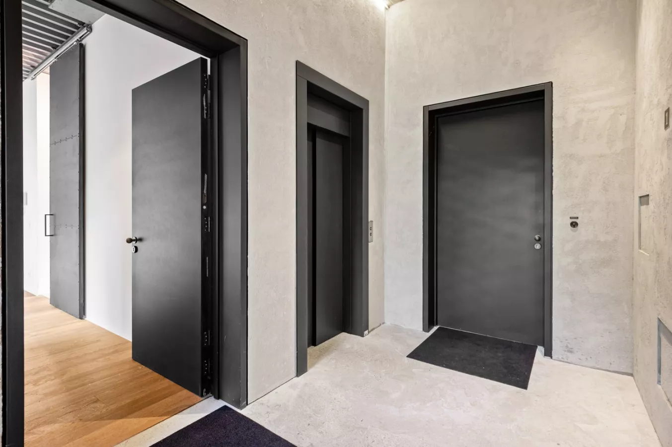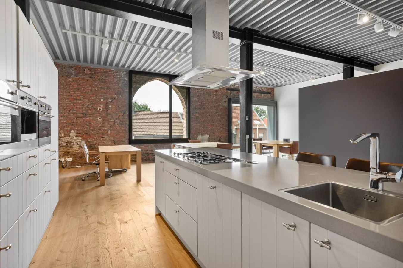 U betreedt het appartement via een ruime inkomhal met vestiairekast, waar meteen de toon wordt gezet: een prachtige massieve eiken parketvloer en een industrieel plafond in staal met karaktervolle verlichtingselementen.