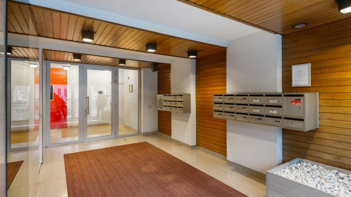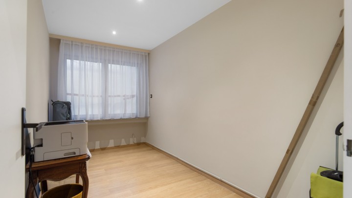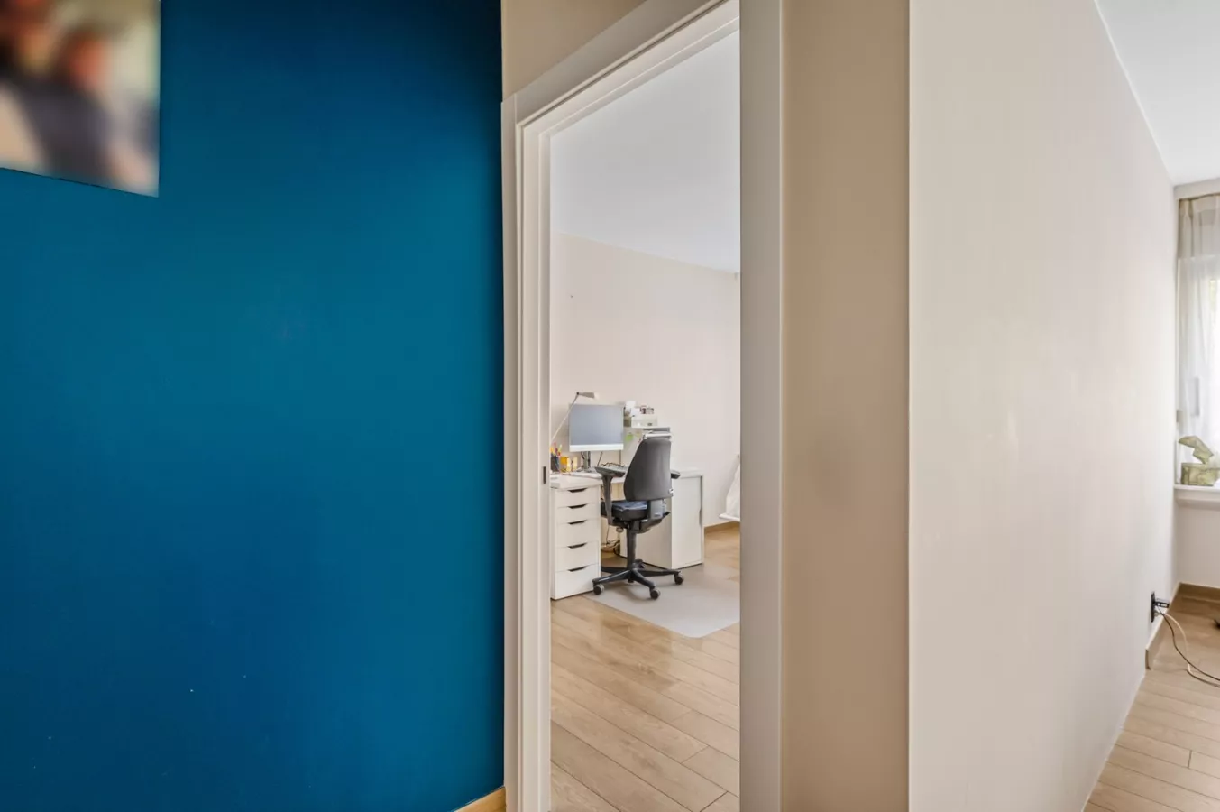 We betreden het appartement via de inkomhal met ingemaakte vestiaire die via een glazen deur toegang geeft tot de riante, lichtrijke leefruimte met grote ramen vooraan en een elektrische sierhaard. Naast de woonkamer bevindt de eerste slaapkamer (12m²).