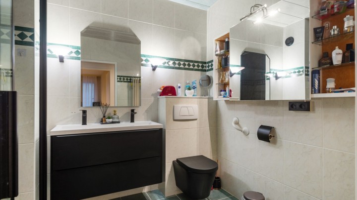 Vervolgens bestaat het appartement achteraan uit twee ruime slaapkamers (14,5m² / 9,5m²), een apart toilet en een mooie badkamer uitgerust met een dubbele lavabo, een inloopdouche en een hangtoilet.