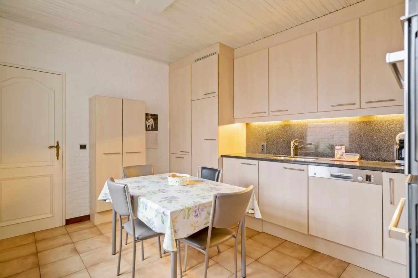 Via de woonkamer bereikt men de modern ingerichte keuken die voorzien is van spoelbak, microgolfoven, oven, inductie, vaatwasser, koelkast en wasmachine.