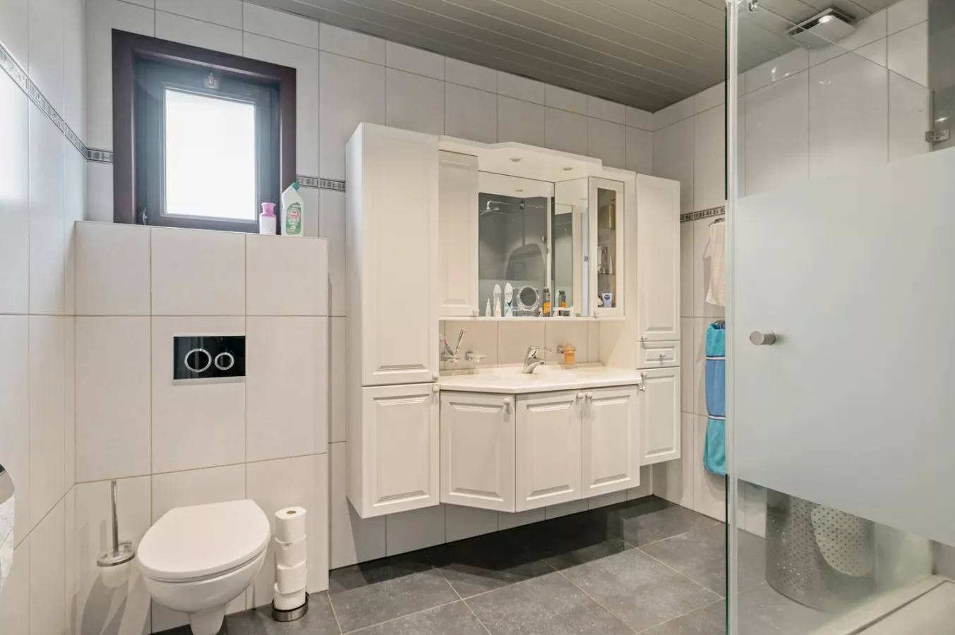 Naast de keuken bevindt zich de badkamer voorzien van een inloopdouche, een enkele lavabo in een badkamermeubel en een toilet.