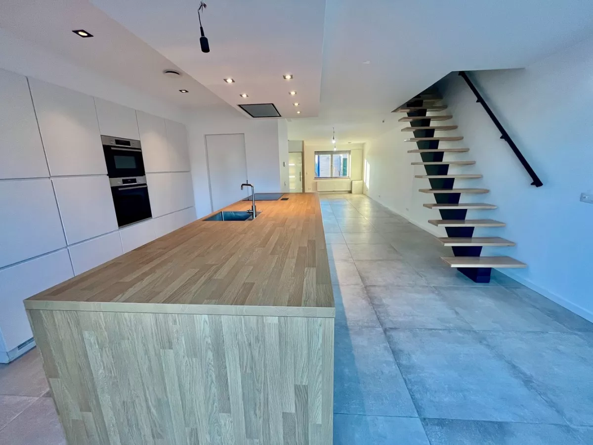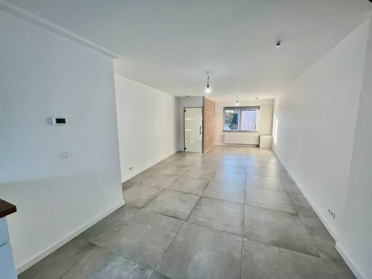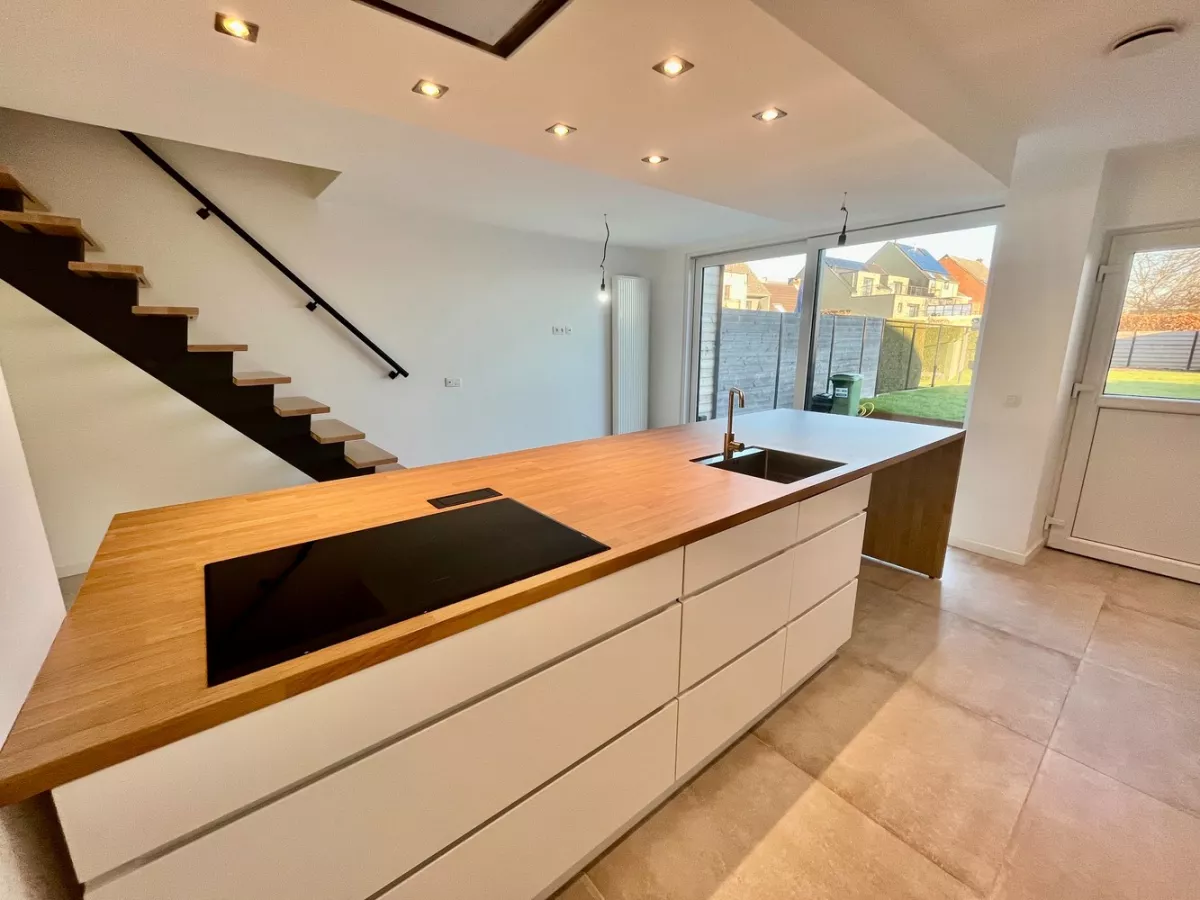 We betreden de woning via de inkomhal die toegang geeft tot de ruime, lichtrijke leefruimte met moderne, open keuken.