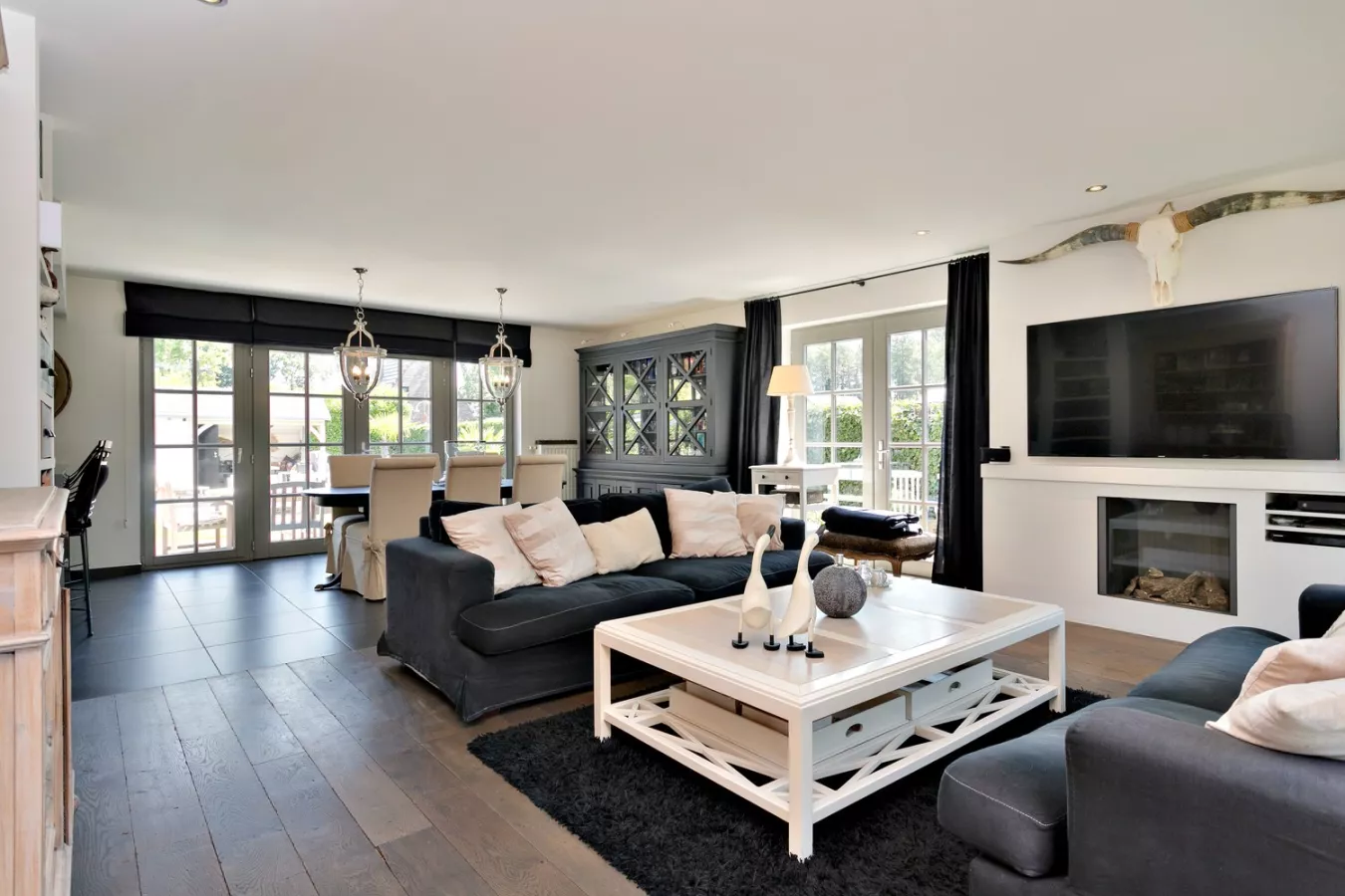 Vanuit de keuken, de leef- en eetruimte geniet men van een mooi uitzicht over de tuin met zwembad en poolhouse, de ideale plaats om tijdens mooi weer volledig tot rust te komen en te genieten in de loungeruimte.
