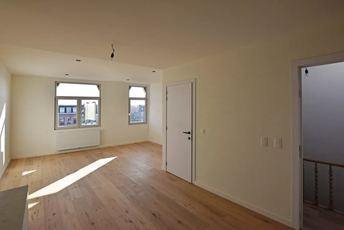 U betreedt het appartement en komt binnen ter hoogte van de keuken. Het appartement werd voorzien van een stijlvolle open keuken, voorzien van alle toestellen (vaatwasser, koelkast, diepvries, kookplaat, dampkap, lavabo met thermostatische kraan, hete luchtoven) en beschikt over een composieten werkblad met marmerlook. Vooraan heeft het appartement een erker van waaruit je een leuk zicht geniet op de straat en over gelegen pleintje. De leefruimte biedt voldoende ruimte tot het plaatsen van een leuke zithoek alsook eettafel.