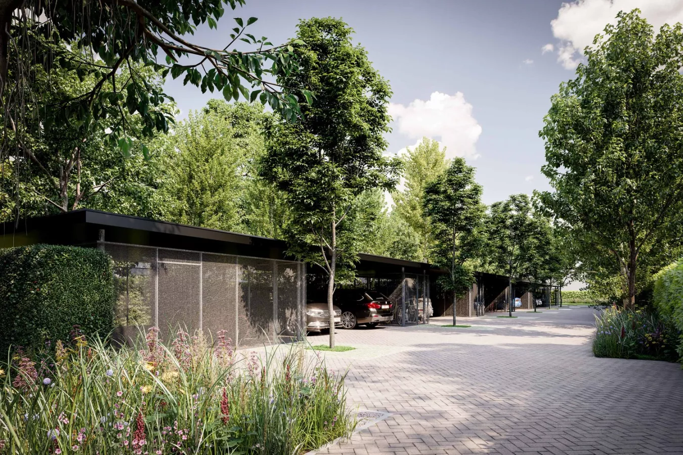 Het project is voorzien van 12 carports met privatieve (fietsen)berging. De aankoop van een carport/berging (€18.500 excl. kosten) is verplicht.
