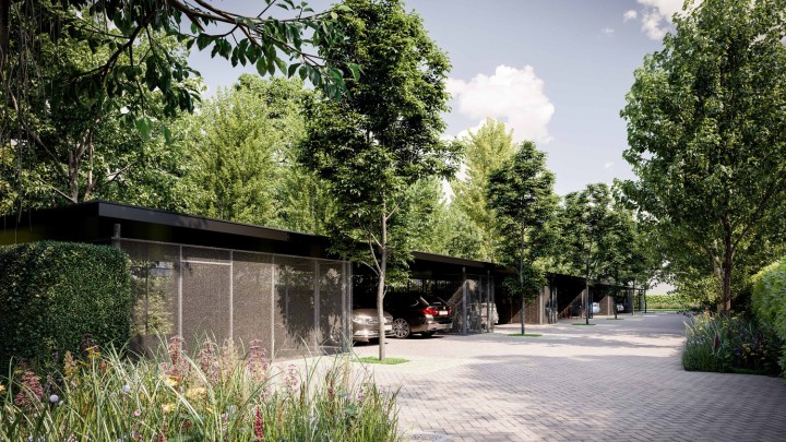Het project is voorzien van 12 carports met privatieve (fietsen)berging. De aankoop van een carport/berging (€18.500 excl. kosten) is verplicht.