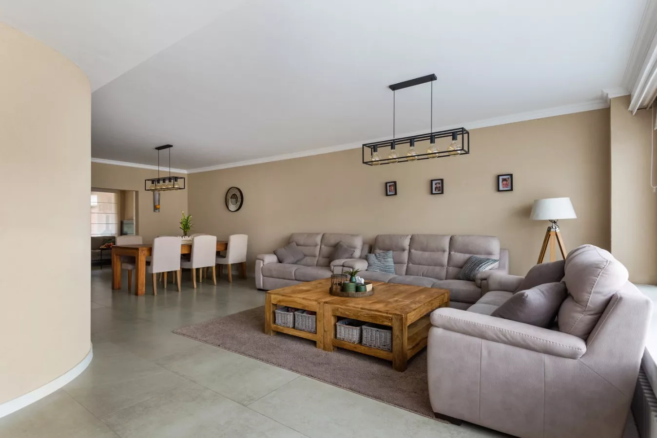 Het leefgedeelte bevindt zich op de eerste verdieping, met vooraan het salon en de eetkamer.
